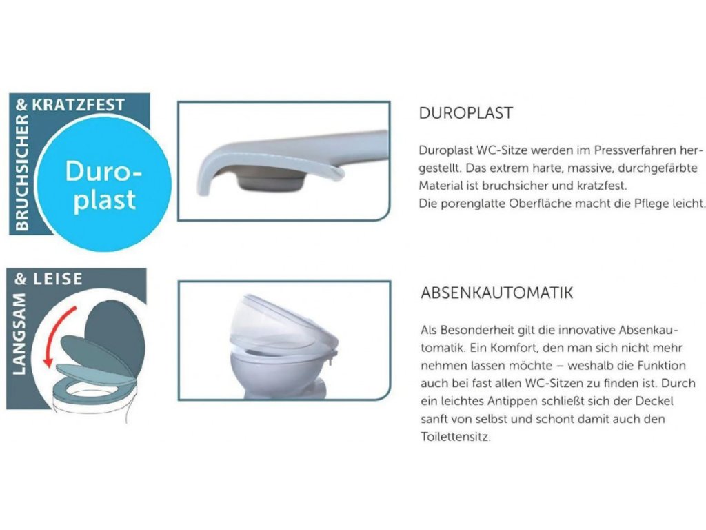 - Díky materiálu Duroplast, který je extrémně odolný proti rozbití a poškrábání, je víko toalety obzvláště odolné