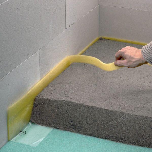 V závislosti na celkové výšce podlahy pro podlahové vytápění se rozhodneme, od které vrstvy začneme pokládat dilatační pás. Pokud jsme zakoupili nejběžněji prodávaný rozměr dilatační lišty o tloušťce 8 mm a výšce 160 mm, nemůžeme ji pochopitelně položit na nejnižší vrstvu, pokud celková konstrukční výška podlahy nepřesahuje výšku lišty. V tomto případě nejprve položte vrstvu stavebního podlahového polystyrenu a teprve poté připevněte ke stěně dilatační pás. Samolepicí vrstva slouží k rychlému přilnutí ke stěně, přinejmenším do doby, než je dilatační pás přitlačen další vrstvou podlahové izolace nebo deskou podlahového vytápění. V prašném prostředí se účinnost samolepicí vrstvy rychle snižuje, ale stále stačí, aby tuto část instalace zvládla jedna osoba. Bez samolepicí vrstvy je praktičtější přizvat pomocníka, který polystyren nebo systémovou desku aplikuje bezprostředně za roznášecí pás. Ujistěte se, že zářezy, kterými se odtrhává pás vyčnívající nad potěr, jsou na horní straně. Svařenou fólii vytáhněte nahoru a poté ji upevněte na místě pomocí krajní trubky podlahového vytápění. Také kvůli tomuto izolovanému spojení mezi stěnou a podlahou se nedoporučuje nahrazovat dilatační pás tenkým stavebním polystyrenem.