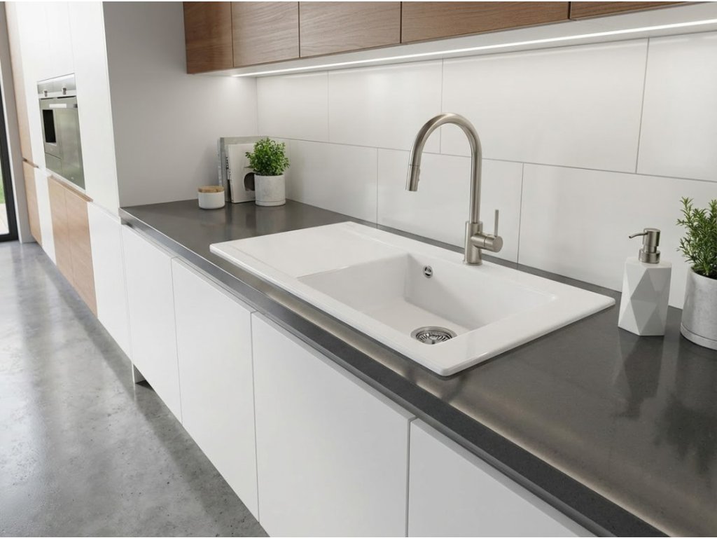 - bílý keramický dřez s odkapem