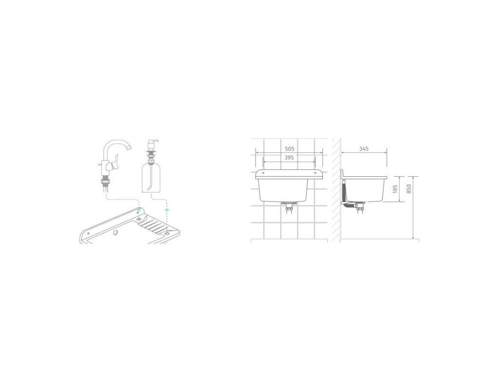 Dřez Compact 505 je montován ke zdi, tudíž není potřeba pracovní desky. Dřez lze umístit i do kuchyňské linky (horní montáž). Je možno také odvrtání otvoru pro baterii nebo dávkovač saponátu či mýdla. Součástí balení jsou montážní šrouby, sifon, přepad, výpust, zátka a odbočka na myčku.